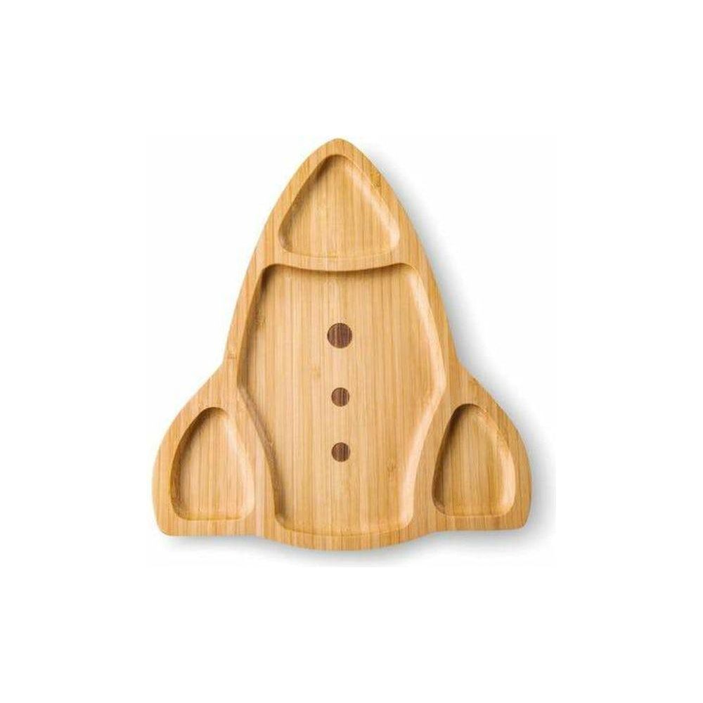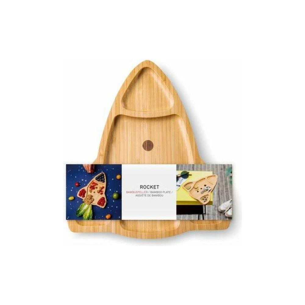 der coole Raketen Bambusteller. Ihre vierteilige Ablagefläche eignet sich für