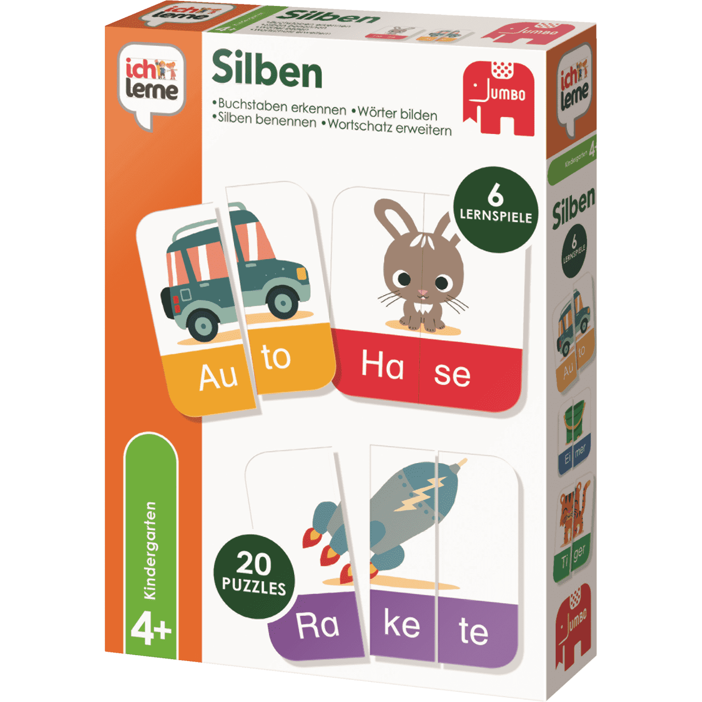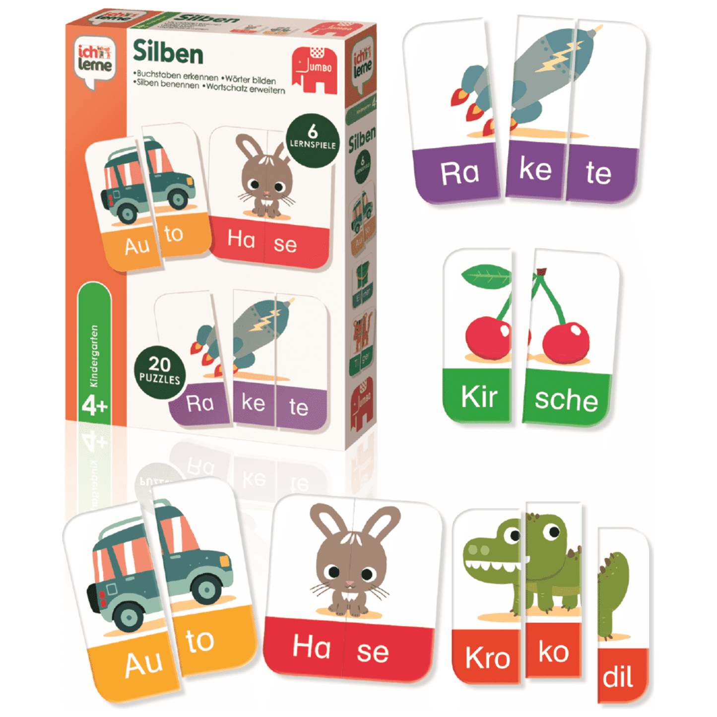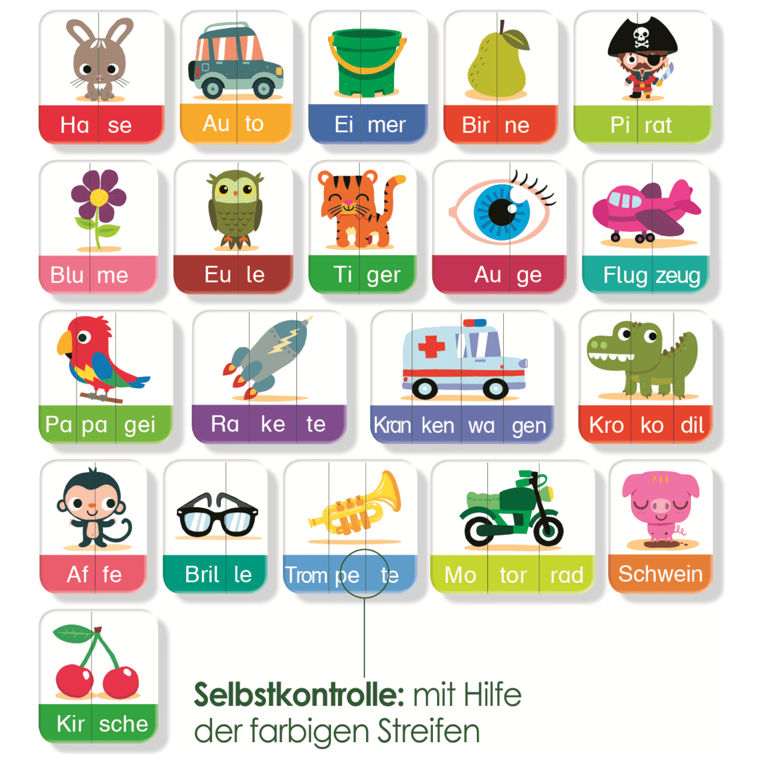 Mit 'Ich lerne Silben' lernen Kinder auf spielerische Weise Buchstaben zu erkennen, Silben zu benennen, Wörter zu formen und den Wortschatz zu vergrößern. Die Worte sind jeweils in 1, 2, 3 oder 4 Silben unterteilt. Erkennst du den Laut? Verbinde die Silben, um ein Wort zu bilden.