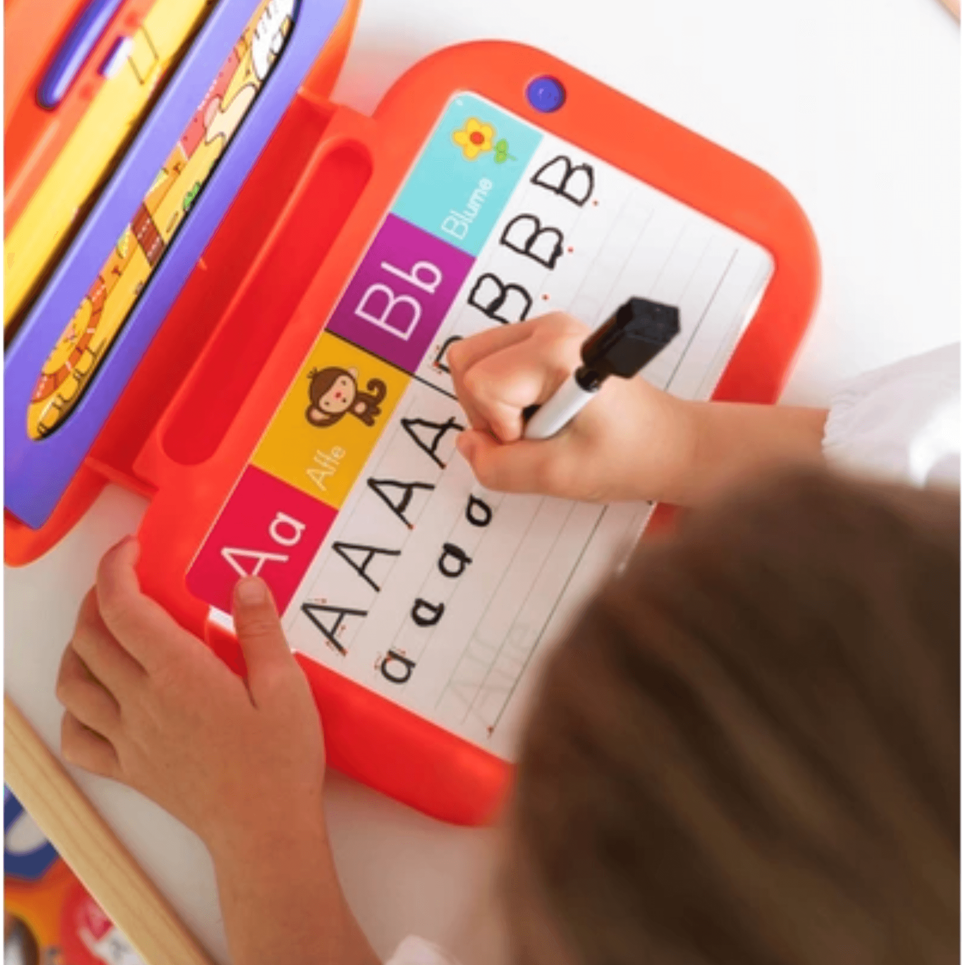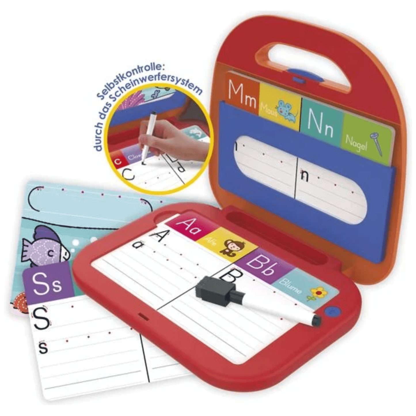 Dieser Lernkoffer unterstützt Kinder bei der Entwicklung ihrer Sprach- und Schreibfähigkeiten, während sie das Alphabet lernen und das Schreiben üben. Er enthält 21 wiederverwendbare Aufgabenkarten, einen Schwamm und einen Stift (abwischbar). Das Spiel ist selbstkorrigierend. 3xAA Batterien werden benötigt für den Betrieb der Leuchtplatte. Sie sind hier nicht enthalten.